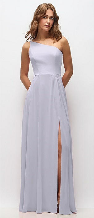 One-Shoulder Chiffon Maxi Dress with Shirred Front Slit in silver dove