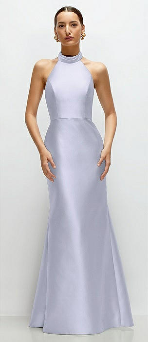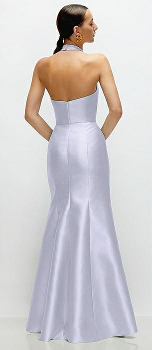 High-Neck Halter Open-Back Satin Trumpet Dress in silver dove