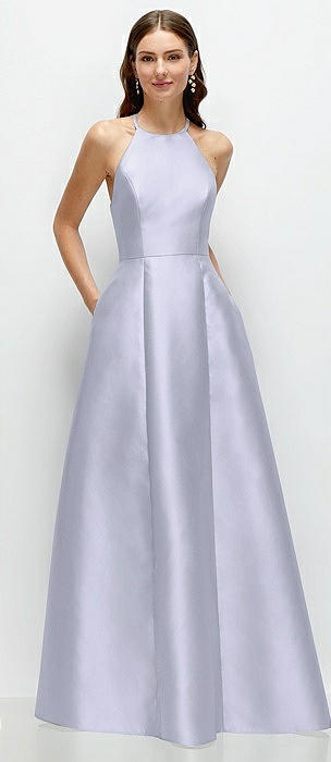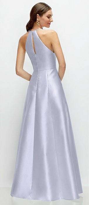 Jewel Neck Halter Full A-Line Satin Maxi Dress in silver dove