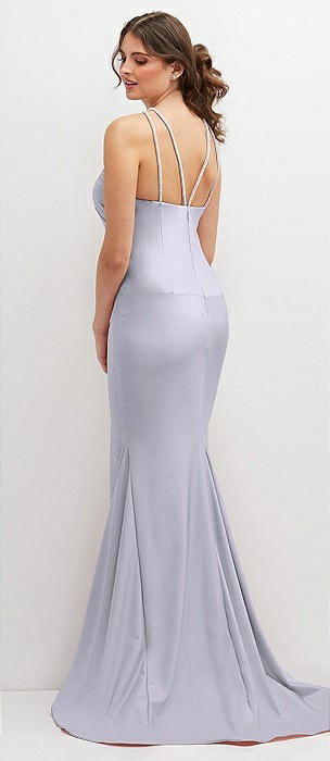 Halter Asymmetrical Draped Stretch Satin Mermaid Dress with Rhinestone Straps in silver dove