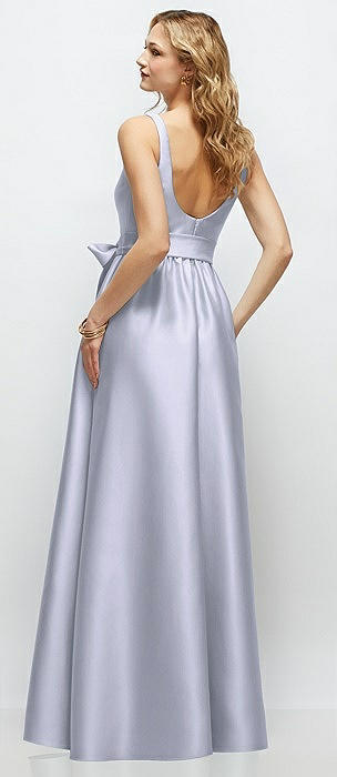 Scoop Neck Corset Satin Maxi Dress with Floor-Length Bow Tails in silver dove