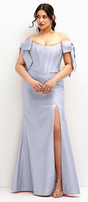 Off-the-Shoulder Corset Stretch Satin Mermaid Dress with Slight Train in silver dove