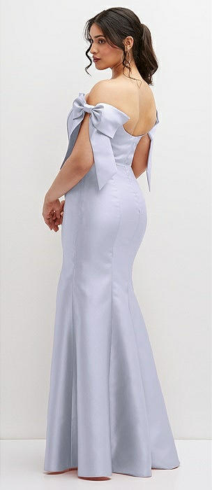 Off-the-Shoulder Bow Satin Corset Dress with Fit and Flare Skirt in silver dove