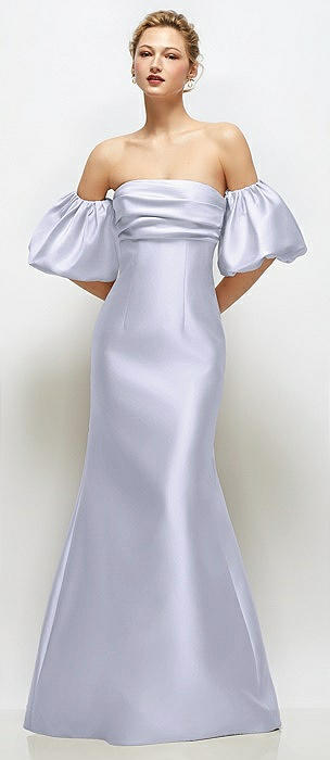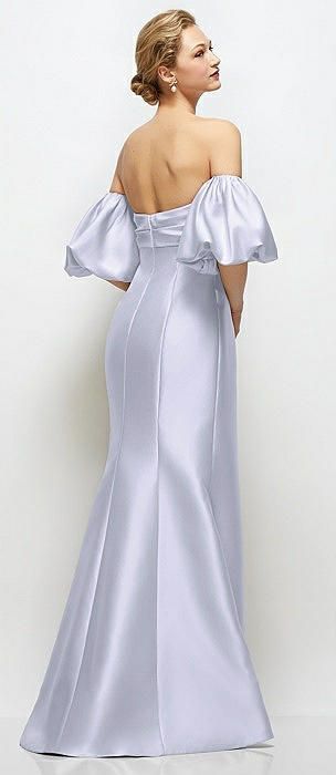 Off-the-Shoulder Puff Sleeve Satin Maxi Dress with Flared Skirt in silver dove