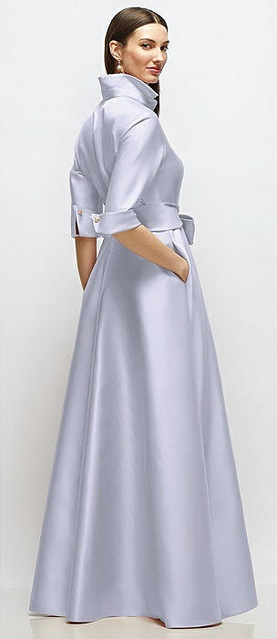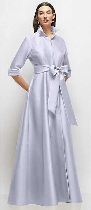 3/4 Sleeve Satin Shirt Dress Gown with Sash and Jeweled Buttons in silver dove