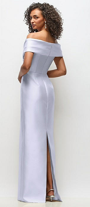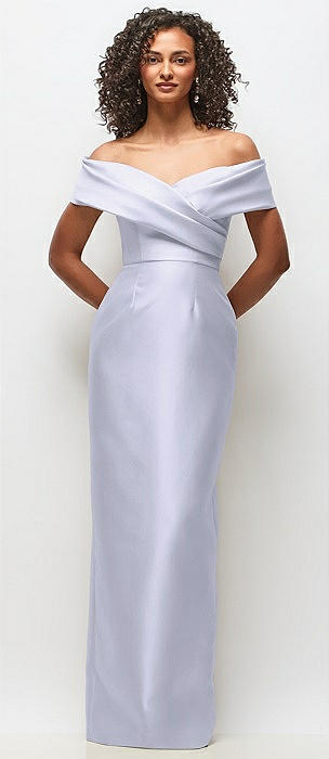 Off-the-Shoulder Draped Wrap Satin Maxi Dress in silver dove