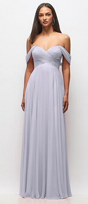 Off-the-Shoulder Draped Chiffon Maxi Dress in silver dove