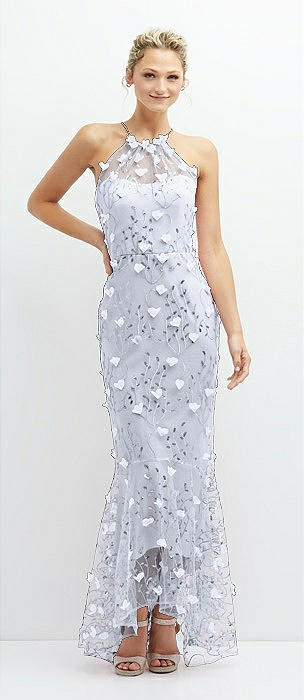 Sheer Halter Neck 3D Floral Embroidered Dress with High-Low Hem