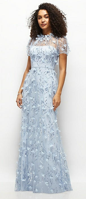 3D Floral Embroidered Puff Sleeve A-line Maxi Dress with Petal-Adorned Illusion Neckline