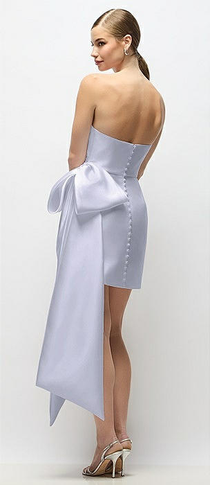Strapless Pleated Draped Satin Mini Dress with Dramatic Long Tail Bow & Covered Buttons in silver dove
