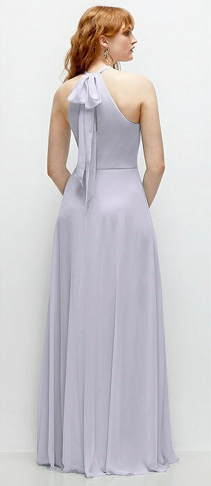 Shirred Halter Chiffon Maxi Dress with Back Sash-Tie Closure in silver dove