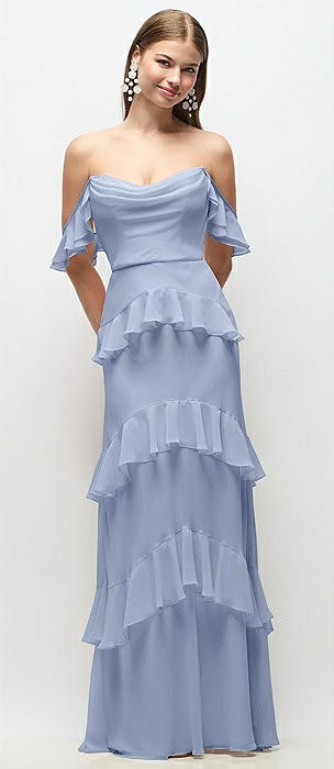 Off-the-Shoulder Cowl Chiffon Tiered Ruffle Maxi Dress with Convertible Ruffle Straps in sky blue