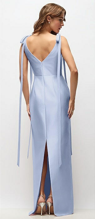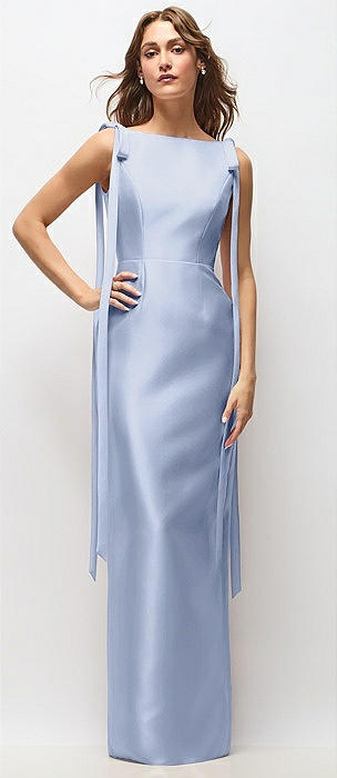 Bateau Neck Satin Column Maxi Dress with Exaggerated Tail Bow Straps in sky blue