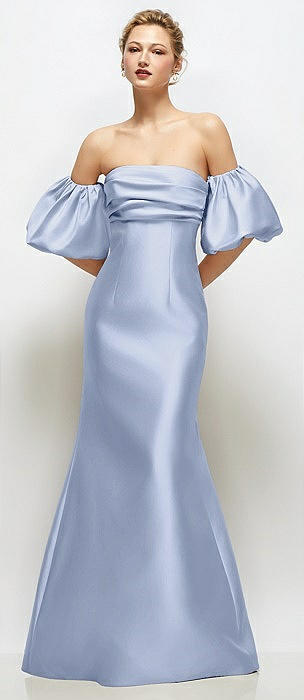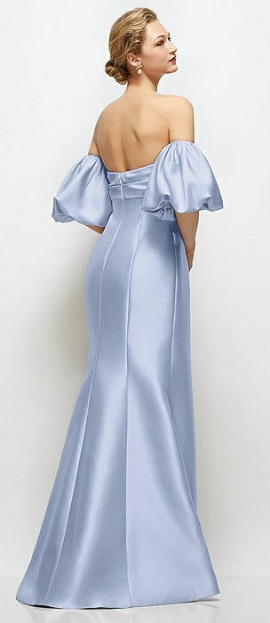 Off-the-Shoulder Puff Sleeve Satin Maxi Dress with Flared Skirt in sky blue