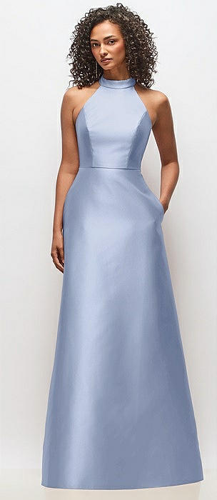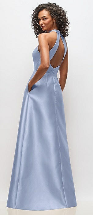 High-Neck Halter Open-Back Satin Trumpet Dress in sky blue