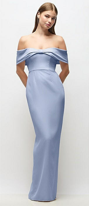 Off-the-Shoulder Crepe Column Maxi Dress with Bow-Pinch Detail in sky blue