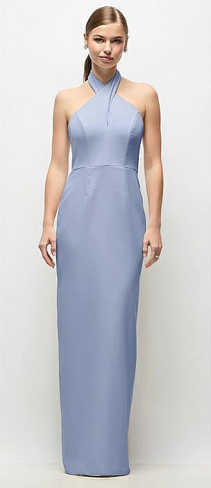 Criss-Cross Halter Open-Back Crepe Column Maxi Dress in sky blue