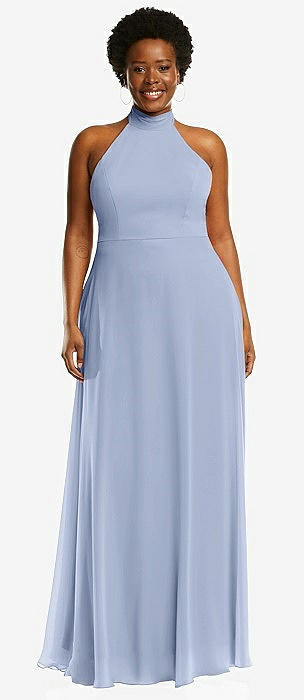 Shirred Skirt Jewel Neck Halter Dress with Front Slit in sky blue