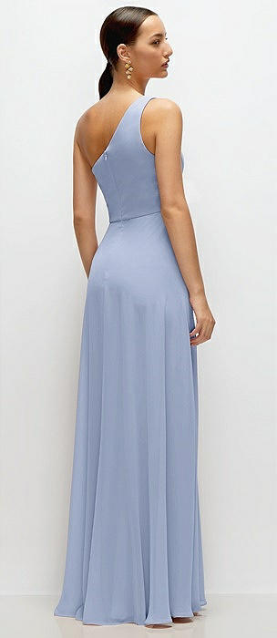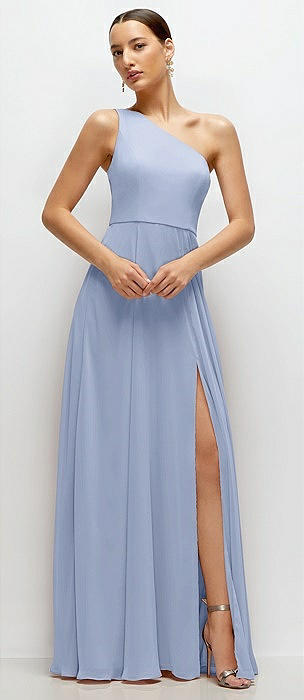 One-Shoulder Chiffon Maxi Dress with Shirred Front Slit in sky blue