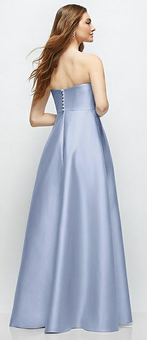 Strapless Satin Gown with Full Skirt and Covered Buttons at Back in sky blue