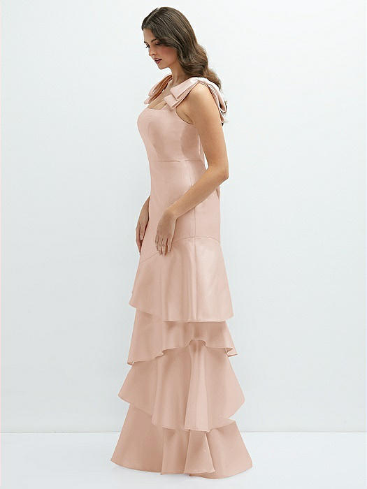 Bow-Shoulder Satin Maxi Dress with Asymmetrical Tiered Skirt in cameo