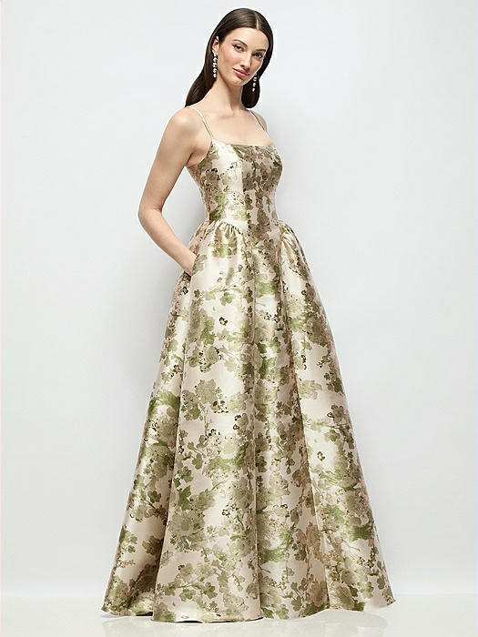 Scoop Neck Drop Basque Skirt Abstract Floral Jacquard Maxi Dress with Pockets in peridot blush
