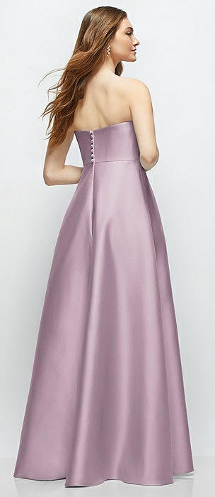 Strapless Satin Gown with Full Skirt and Covered Buttons at Back in suede rose