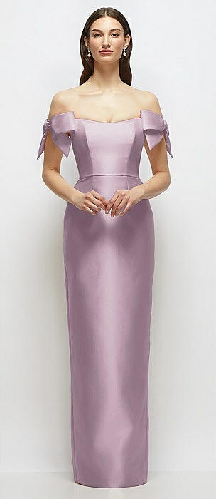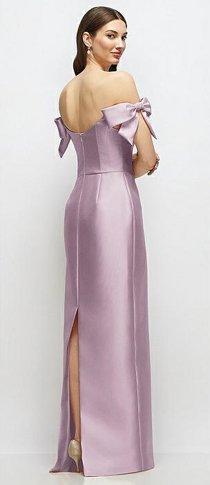 Basque-Neck Satin Column Maxi Dress with Off-the-Shoulder Bows in suede rose