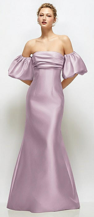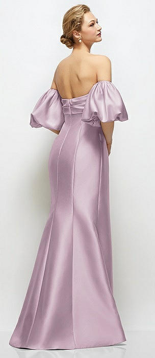 Off-the-Shoulder Puff Sleeve Satin Maxi Dress with Flared Skirt in suede rose