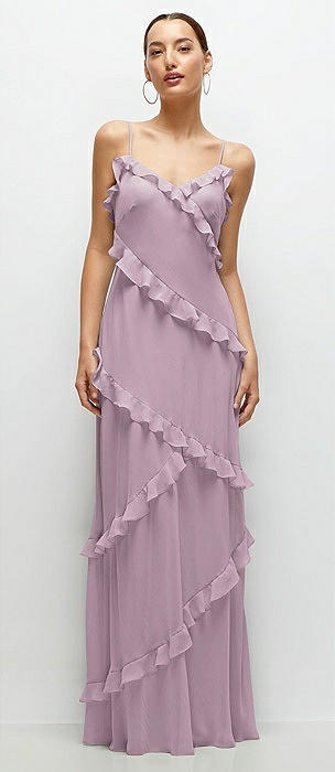 Asymmetrical Ruffle Chiffon Bias Slip Maxi Dress in suede rose