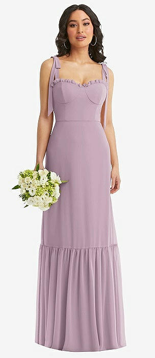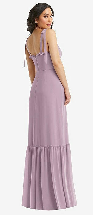 Tie-Shoulder Bustier Bodice Ruffle-Hem Maxi Dress in suede rose