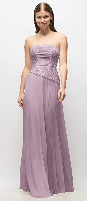 Strapless Chiffon Maxi Dress with Asymmetrical Ruched Drop Waist in suede rose