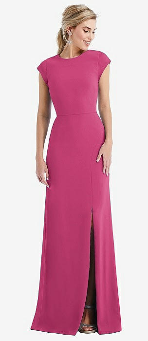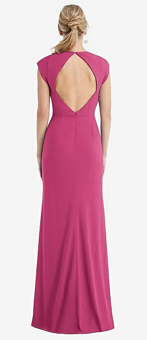 Cap Sleeve Open-Back Trumpet Gown with Front Slit