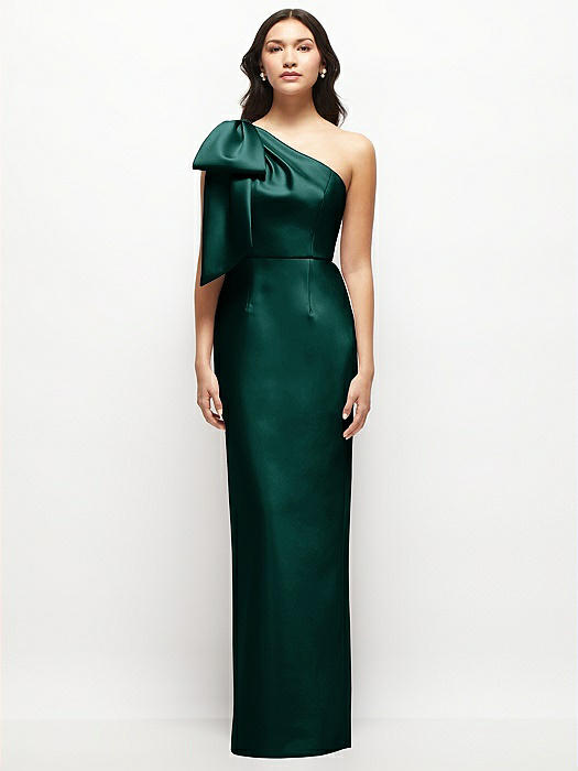 Oversized Bow One-Shoulder Satin Column Maxi Dress in evergreen