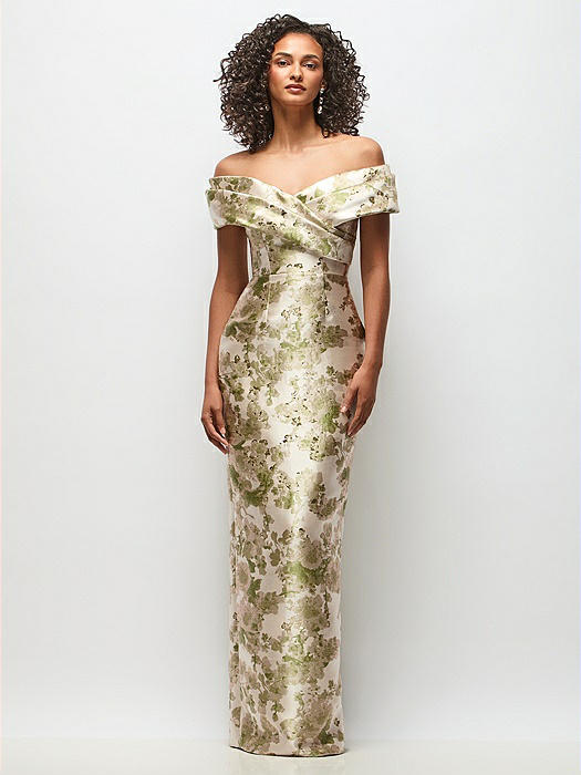 Draped Wrap Off-the-Shoulder Abstract Floral Jacquard Column Maxi Dress in peridot blush