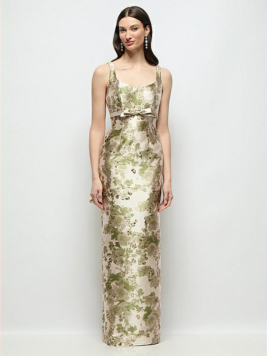 Scoop Neck Abstract Floral Jacquard Column Maxi Dress with Bow Empire Waist in peridot blush