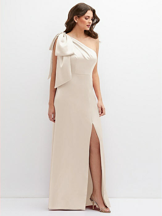 One-Shoulder Satin Maxi Dress with Chic Oversized Shoulder Bow in oat