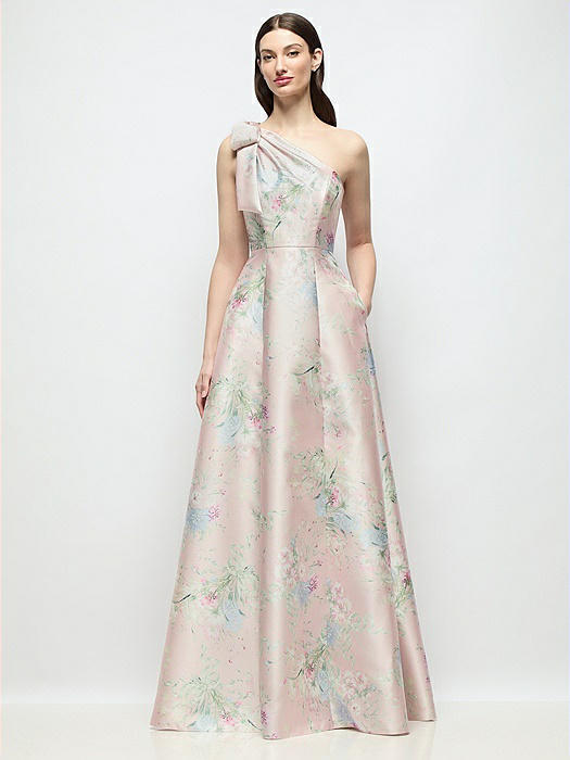 Bow One-Shoulder Full A-Line Esme Floral Satin Maxi Dress in esme floral