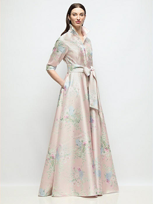 3/4 Sleeve Esme Floral Satin Shirt Dress Gown with Sash & Jeweled Buttons in esme floral