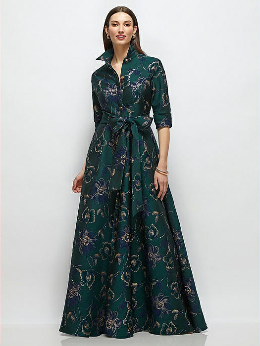 Oscar Metallic Floral Jacquard Shirt Dress Gown with Sash and Jeweled Buttons in evergreen floral