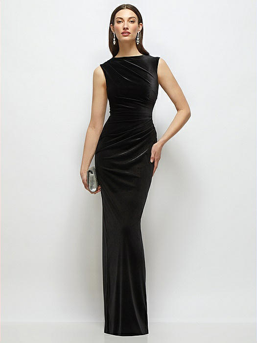 High-Neck Cap Shoulder Pleated Bodice Velvet Column Maxi Dress in black