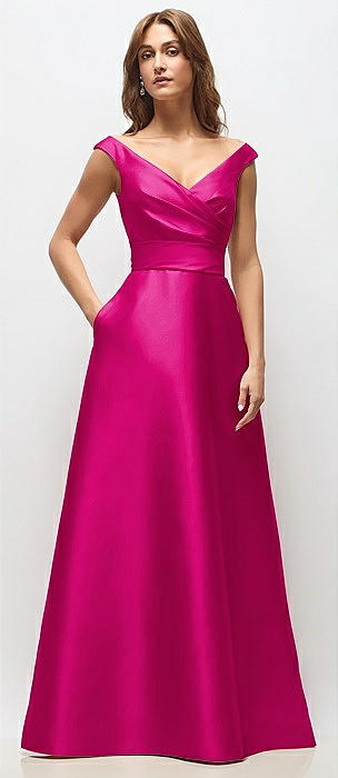 Off-the-Shoulder Draped Wrap Satin Maxi Dress in think pink