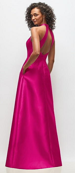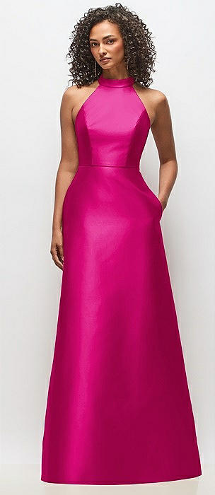 High-Neck Halter Stretch Satin Maxi Dress with Bias A-line Skirt in think pink
