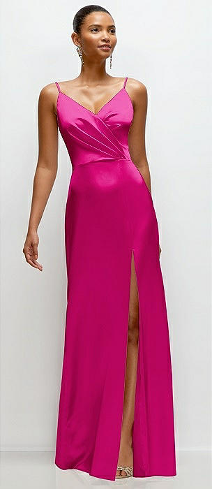 Pleated Faux Wrap Satin Maxi Dress with Adjustable Spaghetti Straps in think pink