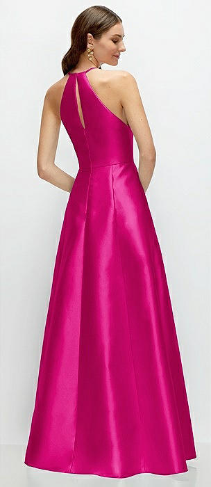 Jewel Neck Halter Full A-Line Satin Maxi Dress in think pink
