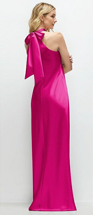 High Halter Tie-Strap Open-Back Satin Maxi Dress in think pink