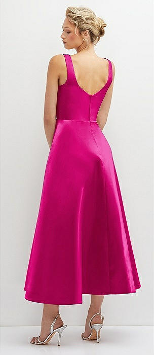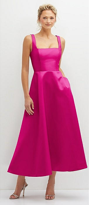 Square Neck Satin Midi Dress with Full Skirt & Pockets in think pink