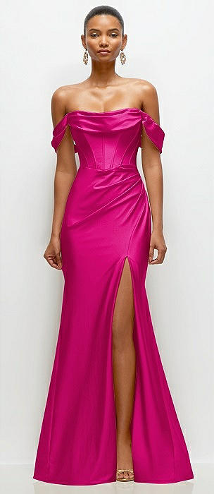 Off-the-Shoulder Corset Stretch Satin Mermaid Dress with Slight Train in think pink