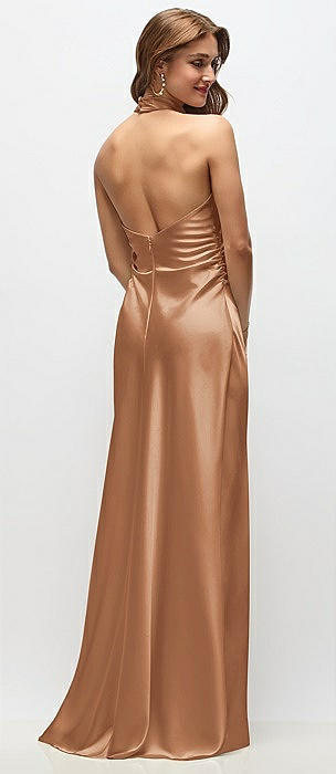 High-Neck Halter Stretch Satin Maxi Dress with Bias A-line Skirt in toffee