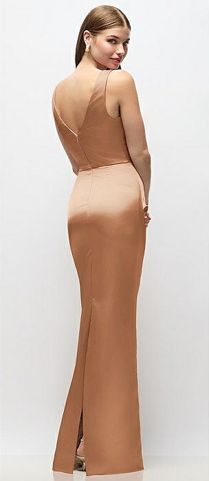 Sleeveless Draped Wrap Bodice Stretch Satin Column Maxi Dress in toffee